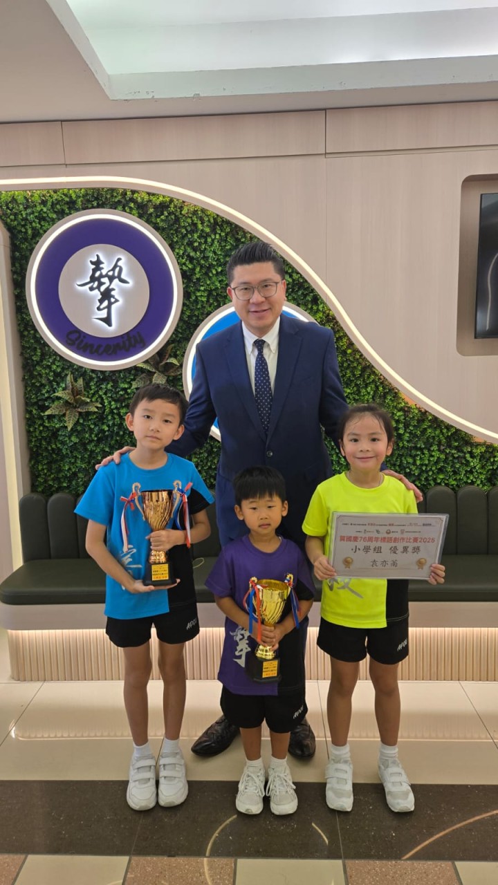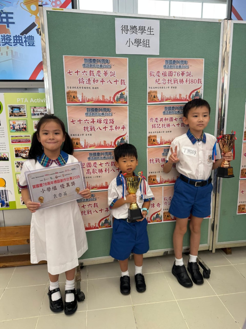 好消息,早前人文科1,2,4年級學生參加賀國慶76周年標語創作比賽2025。恭喜1A李煦日同學獲得冠軍、4C丁熙時同學獲得季軍和2D袁亦萳同學獲得優異獎,可喜可賀!以下是他們出席頒獎禮和作品相片。