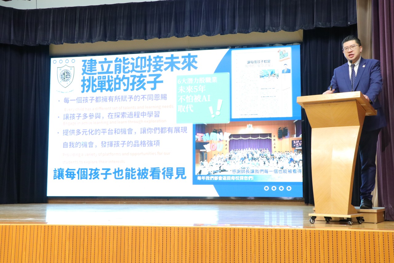 李德衡校長跟家長分享本校的發展,讓家長了解本校注重多元學習,️尤其在靈育和價值觀教育方面的努力,家長對孩子的未來都充滿期待。