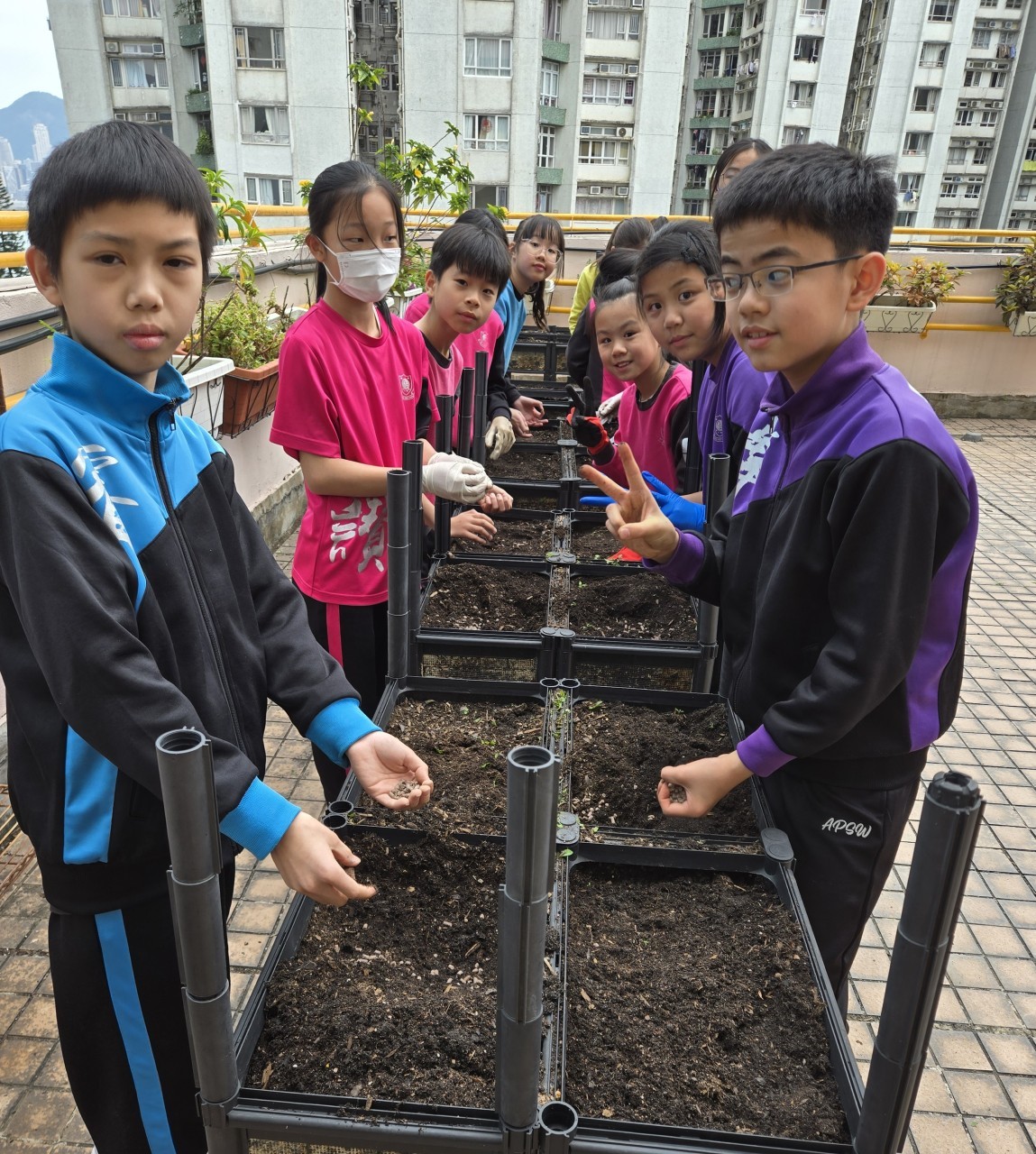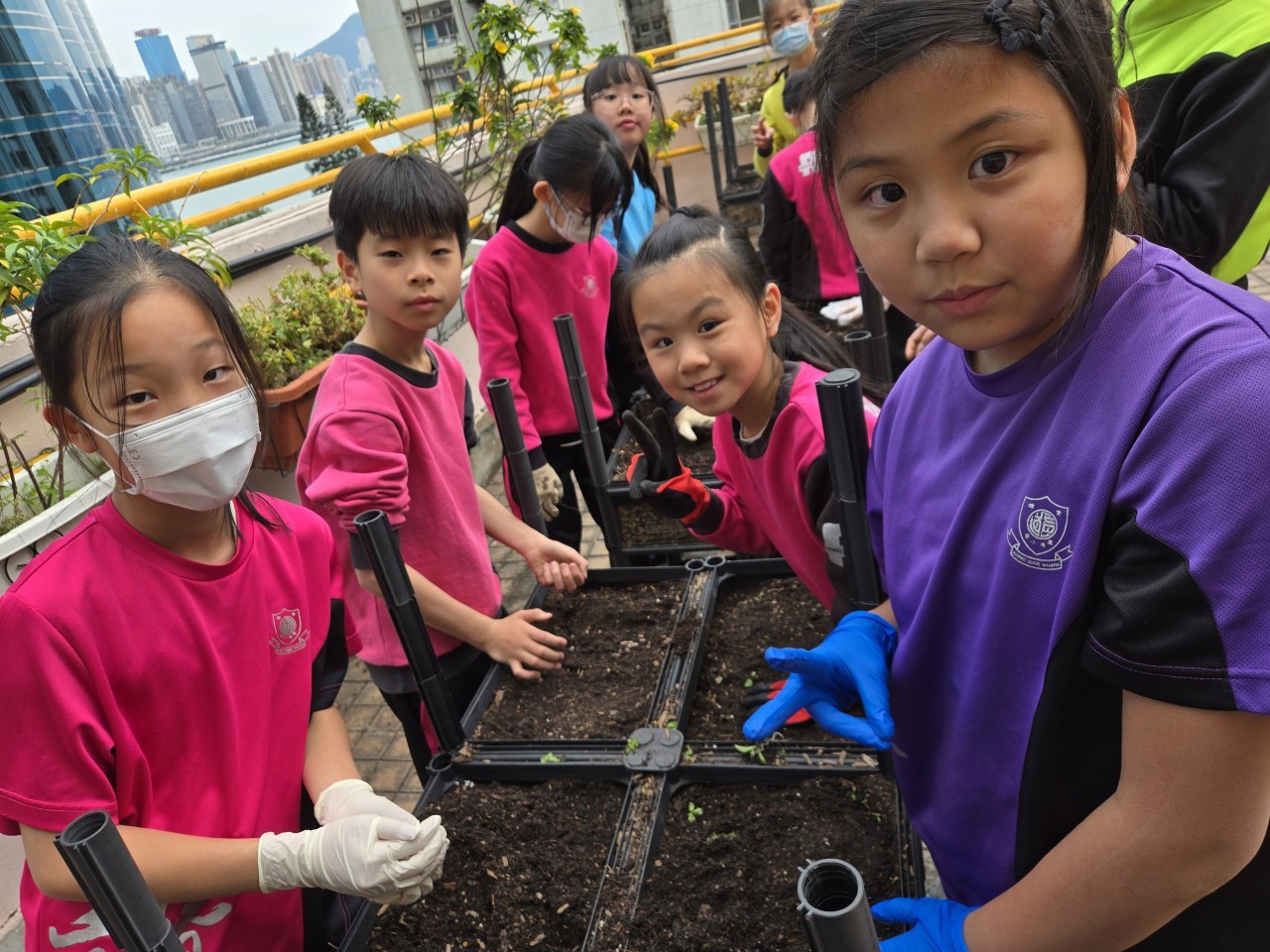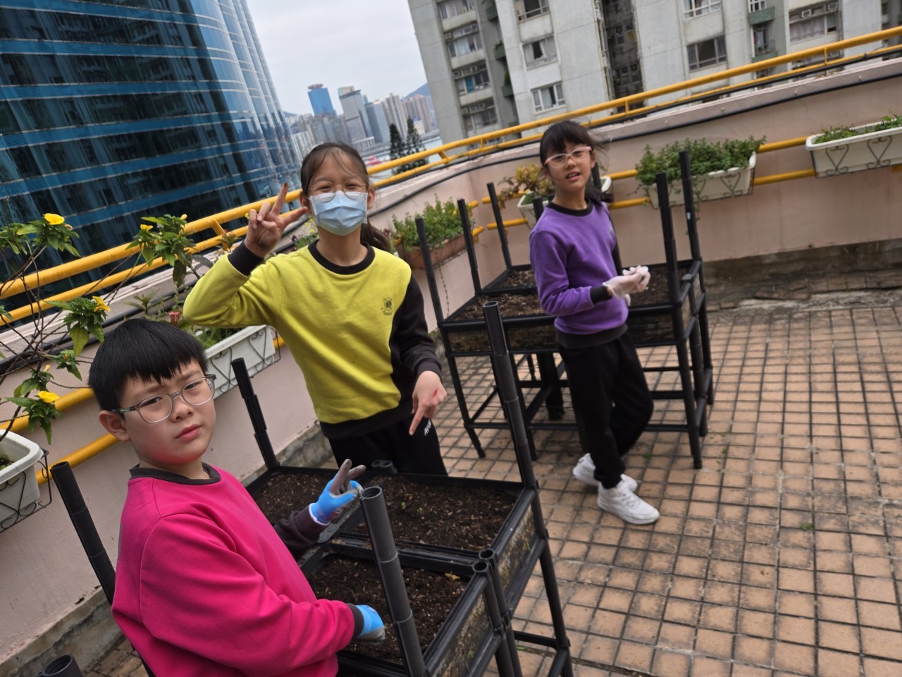 為了讓學生體會種植的樂趣及與家人朋友分享種植的成果。本校參加了網上電價計劃,在校內三樓空中花園進行有機種植活動,讓學生在種植的過程中,培養耐性及對環境的關愛,並對食物的尊重及珍惜。今年20位四至六年級的同學在下學期透過6次學習課及三個月的種植體驗學習有機種植。學生的學習共分兩個階段,第一個階段配合4次的種植課,學習下種、澆水、施肥、除草除蟲及收割等種植技巧,老師會從旁指導。第二個階段,加入兩個的種植課,並一個月自行種植期,學生利用三個小息自行照顧農作物。從學生所分享的心得及感受可知,學生與種植作物產生更大的連繫感和責任感,學生也邀請同班同學參觀自己的種植箱,分享種植的樂趣。